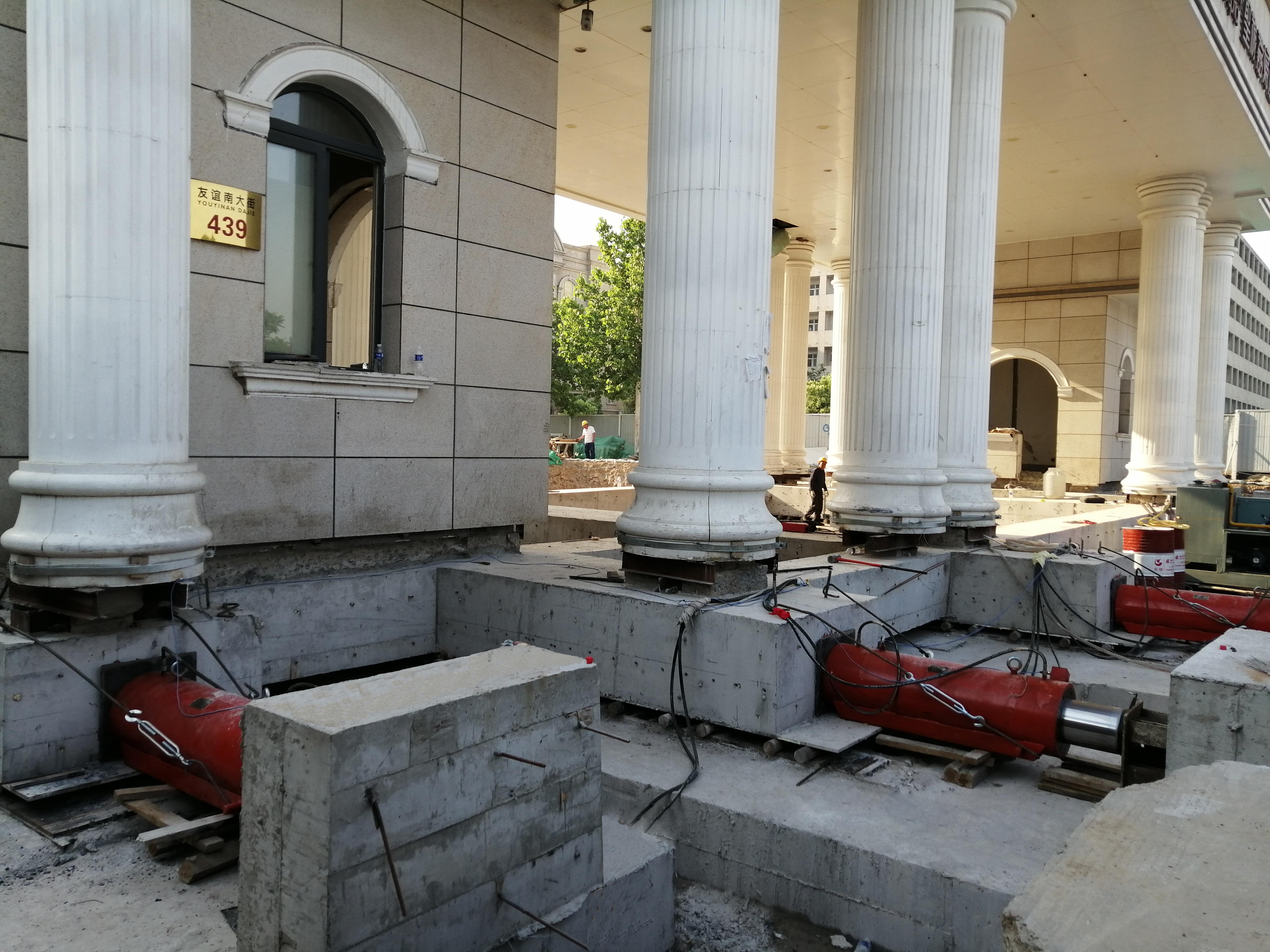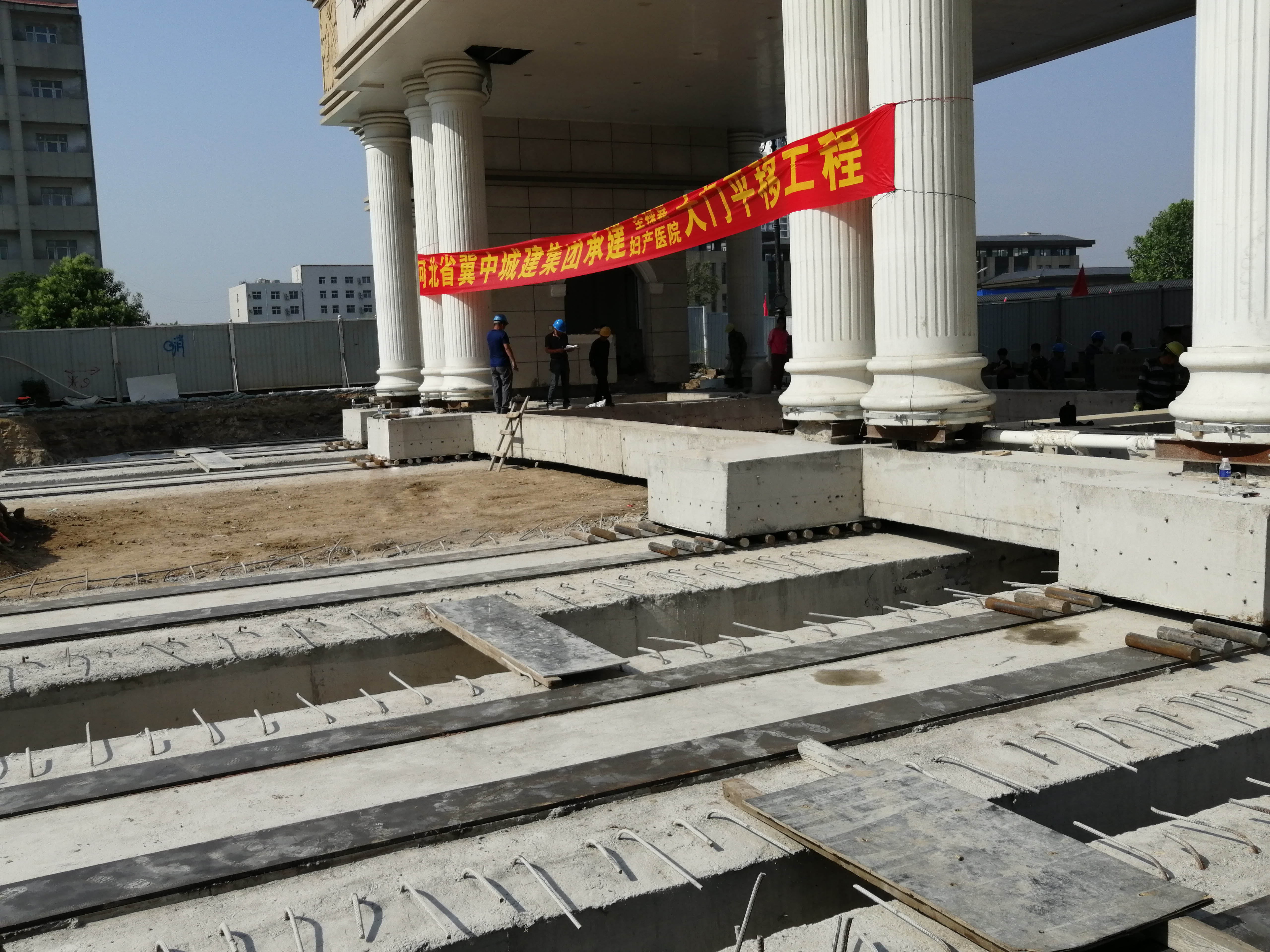 圣禄嘉妇产医院门楼结构形式为框架结构,下部为柱下独立基础 ,基础埋深1.6米,地上一层 ,总跨度27.3米,进深9米,总高度7.2米。门楼整体平移距离7.5米,平移总重量1500多吨 。平移自下而上采用地梁+钢辊轴+双托梁的结构形式 ,水平移位的施力方法采用PLC控制的6台同步位移千斤顶顶推方式 ,每台顶力为308吨,水平位移滚动装置采用实心钢辊轴,通过可移动的活动反力装置提供反力来推动建筑。为保证平移准确就位,施工中需要调整辊轴以保持和轴线的垂直。顶进工作从2020年5月30日20时开始,至5月31日12时顺利就位 ,共用时16个小时。整个顶进快速安全 ,节约了建设成本,减少了建筑垃圾,不仅有利于城区环境 ,还解决了市政道路拓宽扩建中既有建筑占压道路红线的难题 ,保证了城市建设的顺利进行